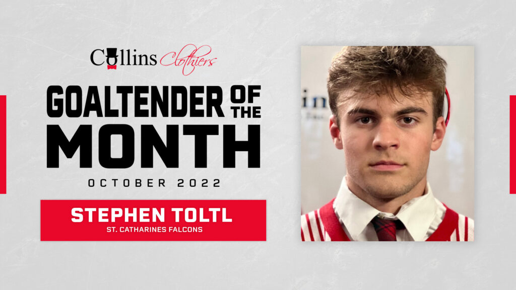 Stephen Toltl of the St. Catherines Falcons has been names the Goaltender of the Month for October. The 17-year-old Hamilton native won all four of his starts earning 2 shutouts while posting a 1.25 goals against average and a stingy .954 save percentage. Toltl’s shutouts came October 2 and 16 against Welland where he kicked out 32 and 22 shots respectively. He now has a record of 5 wins and 2 losses on the season with 3 shutouts, a sparkling 1.29 goals against average and a .951 save percentage. Toltl is in his rookie season in the GOJHL after playing with the AAA U18 Niagara North Stars for the 2021-22 season.