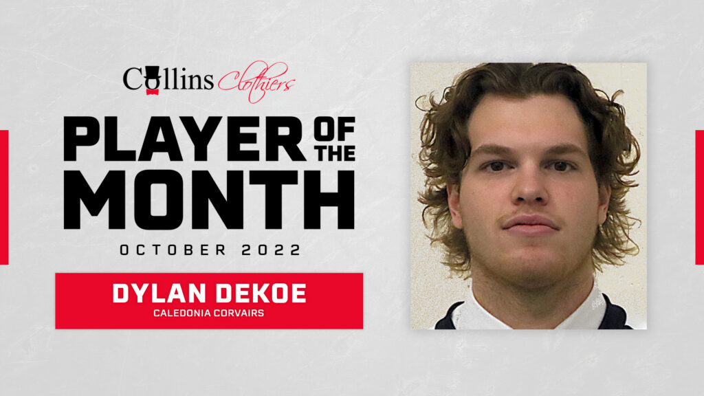 Dylan Dekoe of the Caledonia Pro-Fit Corvairs is October’s Player of the Month after picking up 8 goals and 14 assists in his team’s 13 games. The 20-year-old Welland native had five 3-point games including two on consecutive nights versus Niagara Falls and Welland. Dekoe leads the GOJHL in scoring with 39 points on 11 goals and 28 assists. He is in his second season with the Corvairs and is having a breakout campaign after picking up 24 points in 20 games last season.