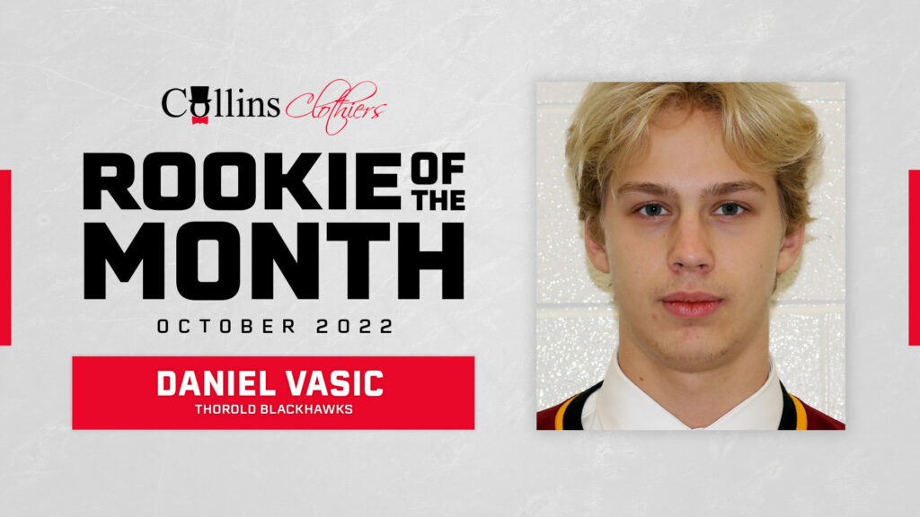 October’s Rookie of the Month recipient is Daniel Vasic from the Thorold Blackhawks. The Newmarket native earned 9 goals and 16 points in 9 games and after a slow start the 16-year-old now has 21 points in 16 games and leads the Blackhawks in scoring. The forward had three, 3-point games in October including a hat trick performance in a victory over Pelham. Vasic was selected in 6th round, 123rd overall, by the Hamilton Bulldogs in the 2022 OHL Priority Draft after playing AAA U16 for the York Simcoe Express last season.