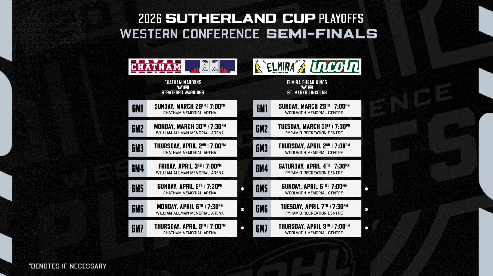 The schedules are set for the four conference semi-final series in the 2026 GOHL Sutherland Cup Playoffs.