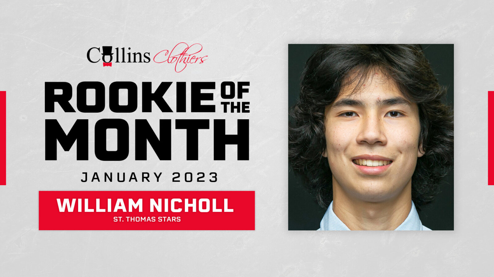 William Nichol from the St. Thomas Stars has been selected as the Rookie of the Month for January. The 16-year-old Ottawa native had a goal and 14 assists in 7 games in the month which included a 5-point game against Komoka on January 13. The rookie leads the Stars in scoring with 53 points in 35 games, good enough for tenth in league scoring. Nichol was chosen in the third round, 52nd overall, by the London Knights in the 2022 OHL Priority Draft and was a member of the GOJHL gold-winning Under 18 team at the recent MacPherson Challenge tournament in Aurora.