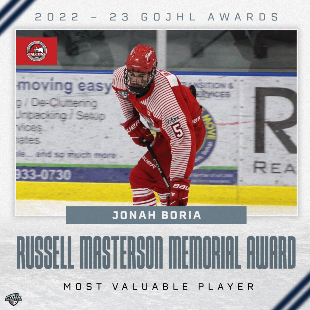 Boria’s regular season was deserving of two major awards. He led the GOJHL in scoring among defencemen with 14 goals and 55 points. 4 of his goals came on the powerplay and 4 were game-winners. The Grimsby native is in his third full season with the Falcons and was selected to participate in GOJHL 2002’s All-Stars versus Brock Badgers exhibition game. He also was the league’s playoff Most Valuable Player last season.