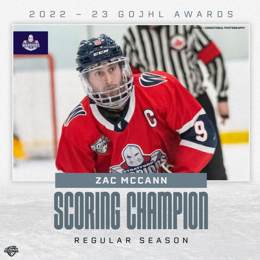 McCann, a Stratford native, led the league in scoring with 83 points on 27 goals and 56 assists. He had 8 powerplay markers and 3 shorthanded goals in his third full season with the club. McCann had a league-high 18-game point-scoring streak (14 goals, 31 assists, and 45 points) and is the first Stratford Culliton/Warrior player to lead the league in scoring since the award was created in 2008.