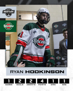 The third-year forward’s hometown team played just one game last week, but it was the biggest of the season and Ryan played a major role, scoring twice and adding two assists for his first career 4-point game in the Lincolns’ convincing 9-1 win over the previously undefeated Cambridge Redhawks. A 13th round pick of the Oshawa Generals in 2022, Ryan leads his team in assists with 18.