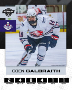 The rookie forward from Mulmur had a pair of 2-goal games in two wins for the Warriors to begin the new year. He scored his first career shorthanded goal in Friday’s 6-2 win over the Vipers. His first goal in Sunday’s 7-3 win in Listowel was his second game winning goal of the season. The Grey Bruce Highlanders alumnus has points in each of his last four games and is second among Warriors rookies with 16 points.