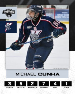 The rookie forward from Vaughan had a goal and an assist in Wednesday’s 7-3 loss to Stratford, then scored a goal in Friday’s 5-2 loss in St. Thomas. He recorded his first career hat trick and added an assist in the Vipers’ 12-3 win over Sarnia on Sunday. All three goals against the Legionnaires were on the power play and he now leads all GOHL rookies with 8 power play goals. Michael’s 21 points are the most among Vipers rookies.