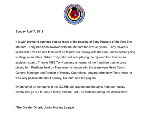 The GOJHL family lost a great member this past weekend w/ the passing of Tony Passero. We wish to extend our condolences to the Passero family & the entire Fort Erie Meteors organization. Tony had tremendous passion for hockey, his team and his players. Rest In Peace Tony.
