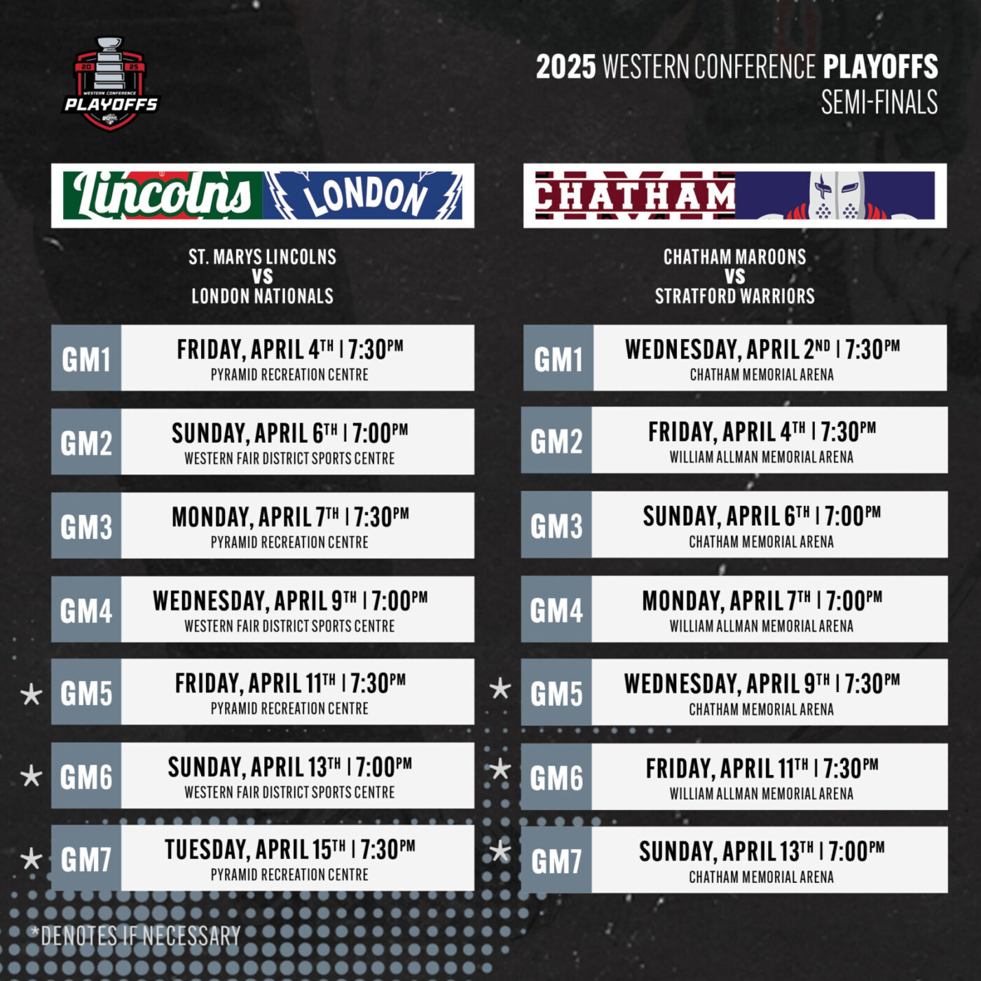 The game schedules for the two Western Conference best-of-7 semi-final series are set. The second round of the 2025 Sutherland Cup Playoffs begins Wednesday when the #2 Chatham Maroons host the #3 Stratford Warriors in a rematch of the 1999 Sutherland Cup Final. The other semi-final starts Friday when the #1 St. Marys Lincolns host the #5 London Nationals, marking the 13th time since 1979 that the two rivals have faced each other in the post-season.